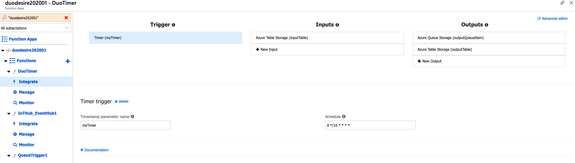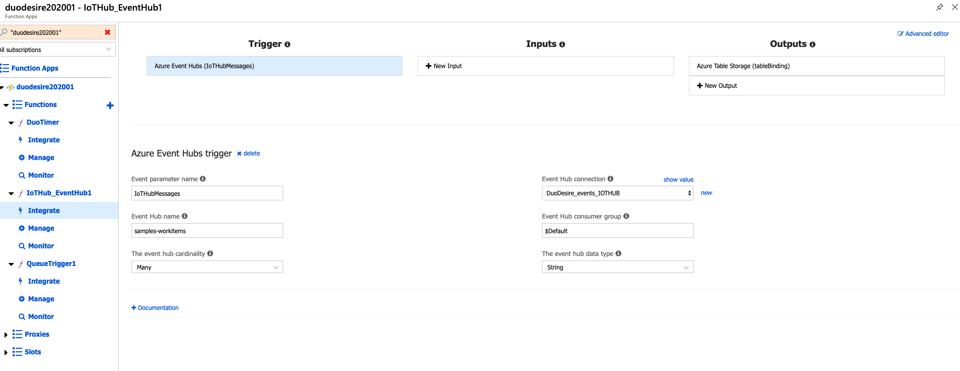 The first of the three functions needed is the function which will process event hub messages. At a high level all this is doing is being invoked any time an event occurs and then just writing the event data to the Azure Table Storage table defined in the configuration. You’ll need to configure it something like: